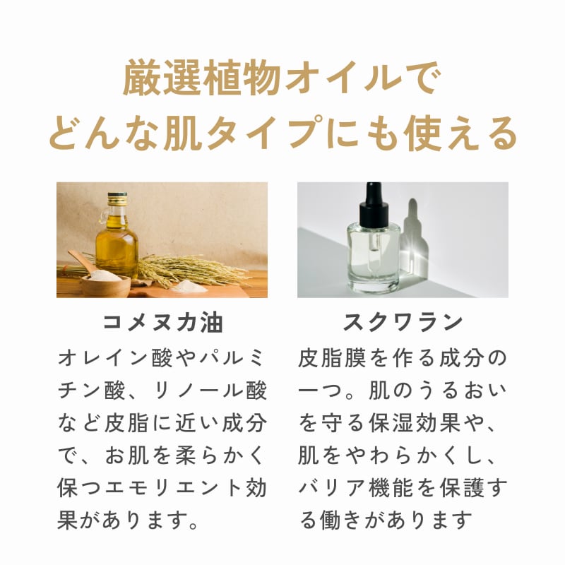米糠から取れたオイル。オレイン酸やパルミチン酸、リノール酸など皮脂に含まれる成分が多いお肌を柔らかく保つエモリエント効果があります