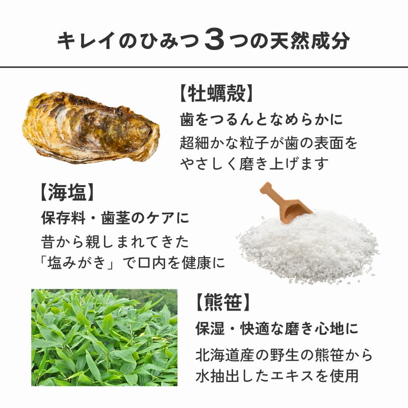 【成分】清掃剤:炭酸Ca 水/潤滑剤:グリセリン/香味剤:海水/研磨剤:シリカ/粘結剤:タマリンドガム/清掃剤:サンゴ末/研磨剤:カキカラ/保湿剤:クマイザサ葉エキス/清掃剤:炭酸水素Na/香味剤:ハッカ油
