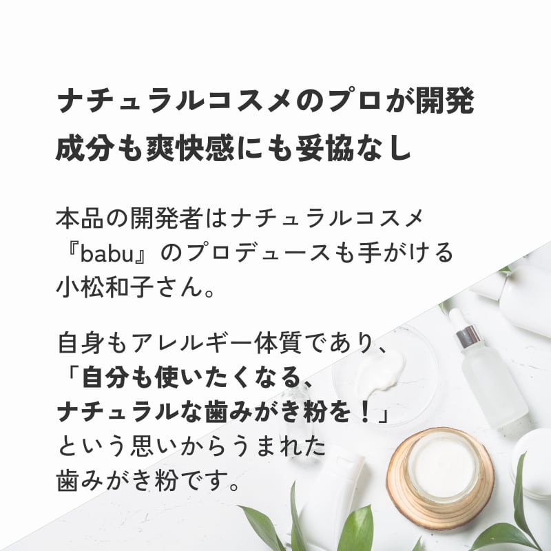歯磨き粉としての洗浄力、消臭力、清涼感、ホワイトニング力などの効果を発揮しつつ、天然原料にもこだわって開発されています。