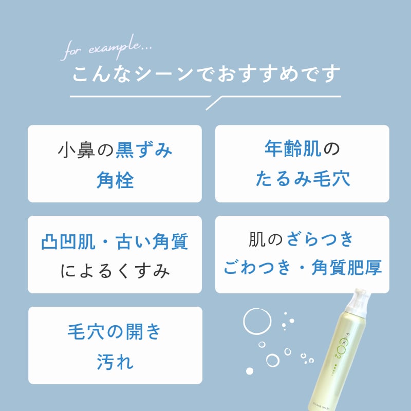 気になる部分に、炭酸泡を1分程のせた後、洗顔します。お肌の状態に合わせ毛穴のお掃除、炭酸泡パックを習慣に。