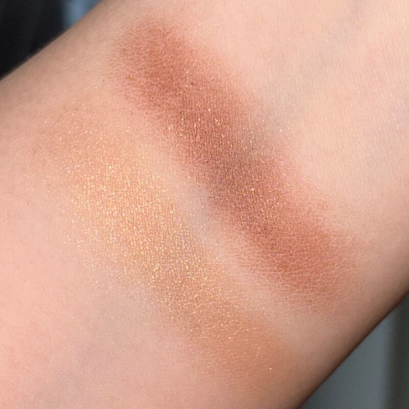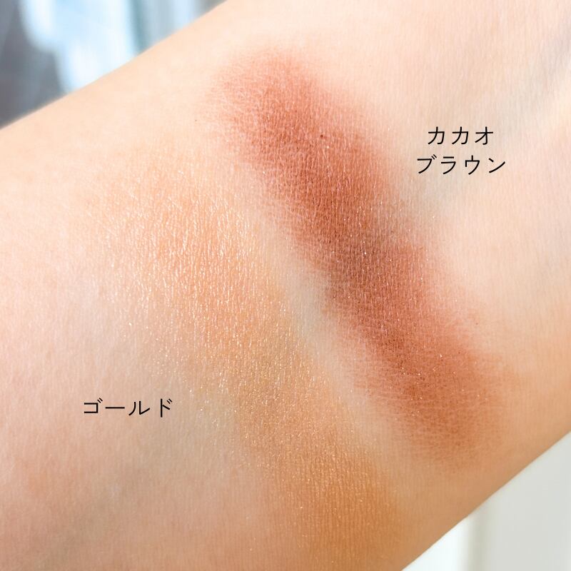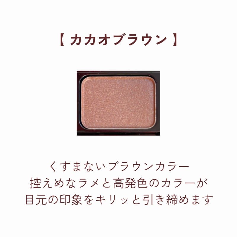 カカオブラウン:ゴールドと混ぜて使用すると優しいブラウンに変化アイブローパウダーとしても使う事ができてやわらかな明るい顔色に。