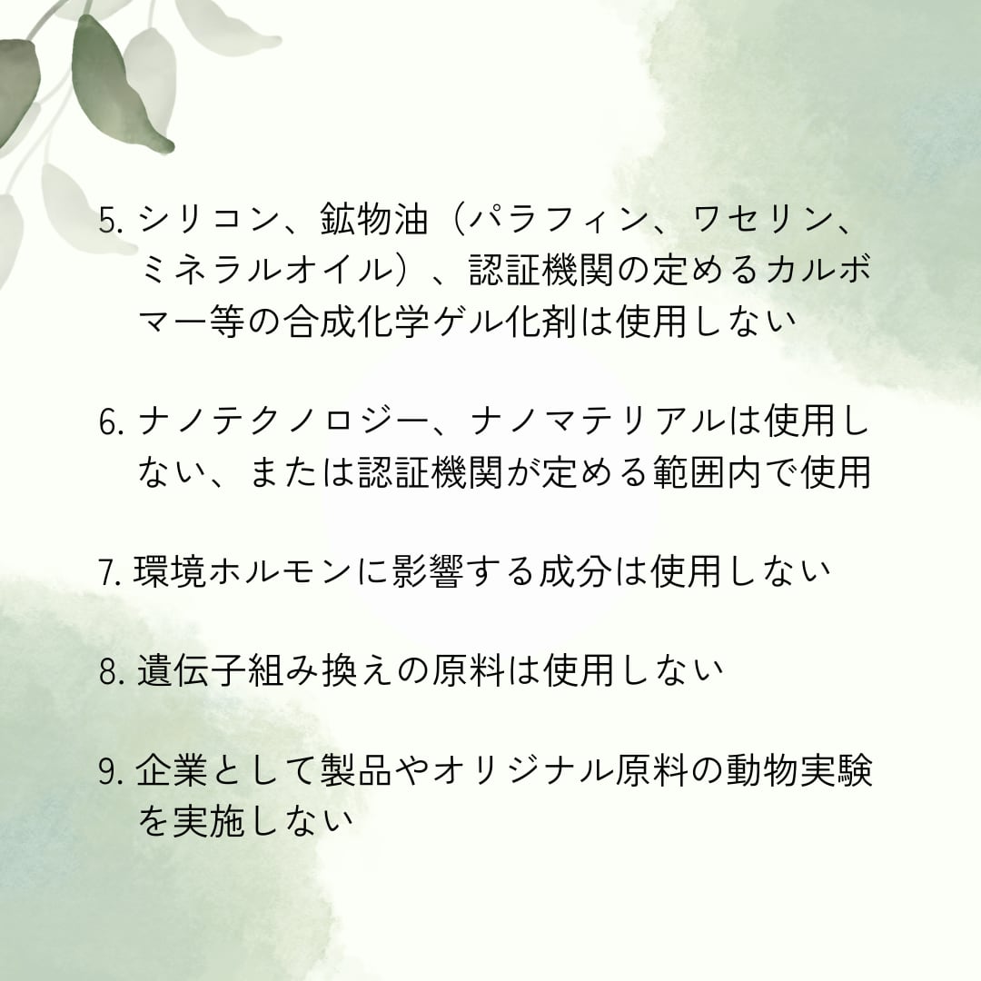 例えばナノ成分、ナノ技術、環境ホルモンの影響、生分解に時間を要するものを使用しないなど、オーガニック認証で定められるような、人と環境に配慮した製品であることが約束されています。