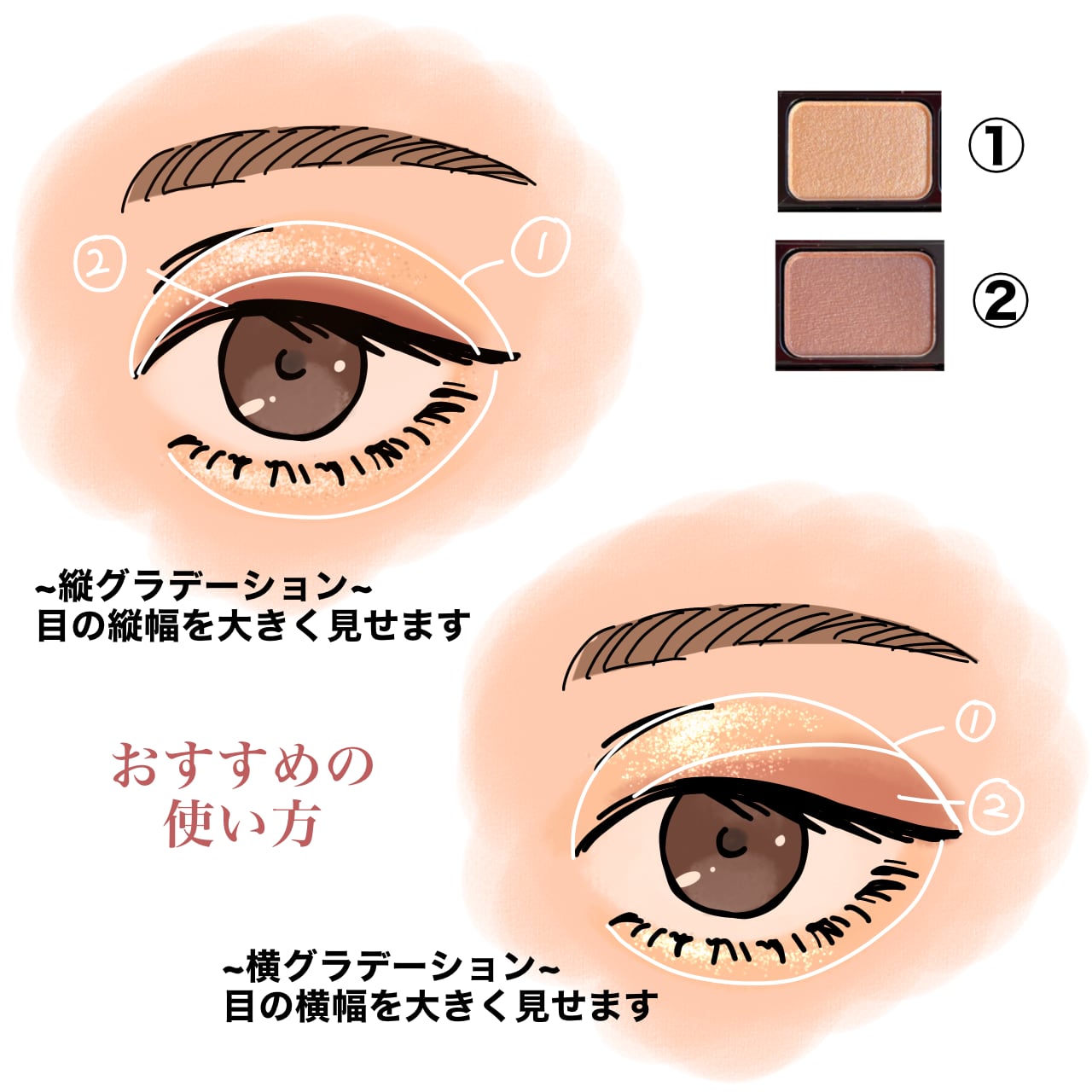 ①2色セットのうち、明るいカラーをアイホール全体に山型になじませます。
