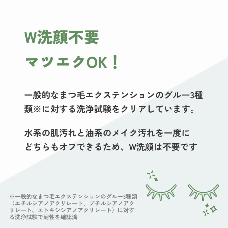 一般的なまつ毛エクステンションのグルー3種類(※5)に対する洗浄試験をクリアしています。水系の肌汚れと油系のメイク汚れを落すとので、W洗顔は不要です。