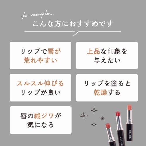 デリケートで乾燥しやすい唇をみずみずしく包み込み、潤いを保ちます。
